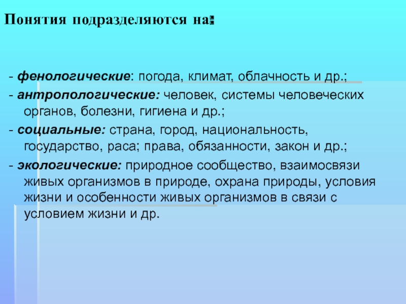 - совокупность существенных признаков, определяющих предмет или явление. Все понятия рассматриваются в единой системе, что обусловлено направленностью курса на формирование у ребенка целостной картины мира.