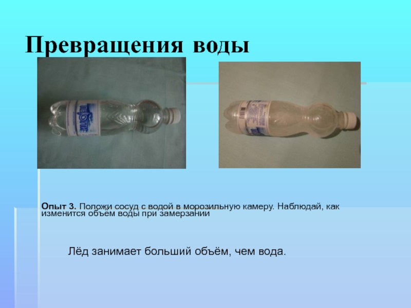 Опыт 3. Положи сосуд с водой в морозильную камеру. Наблюдай,
