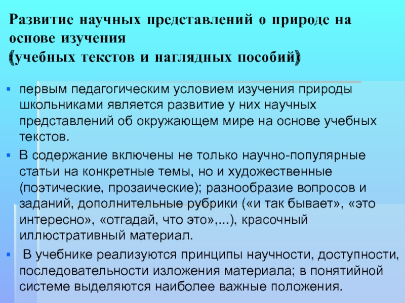 первым педагогическим условием изучения природы школьниками является развитие у них научных представлений об окружающем мире на основе учебных текстов.