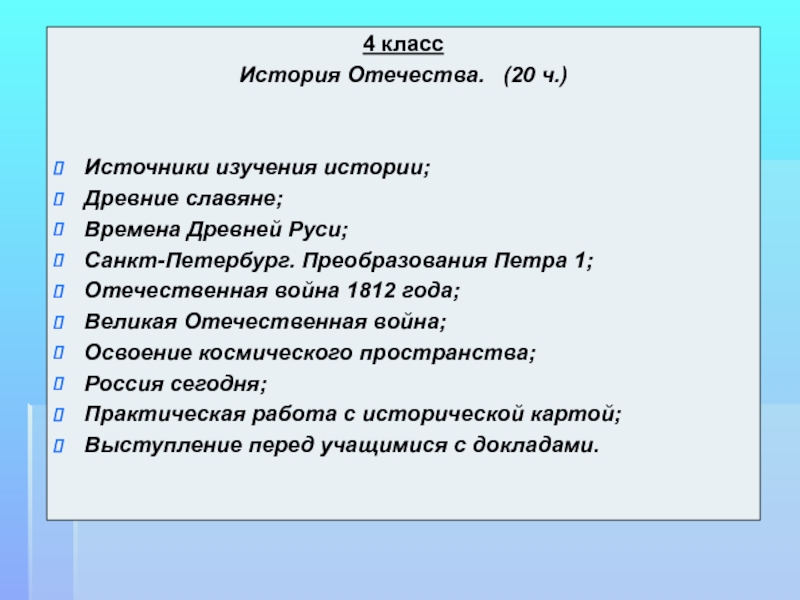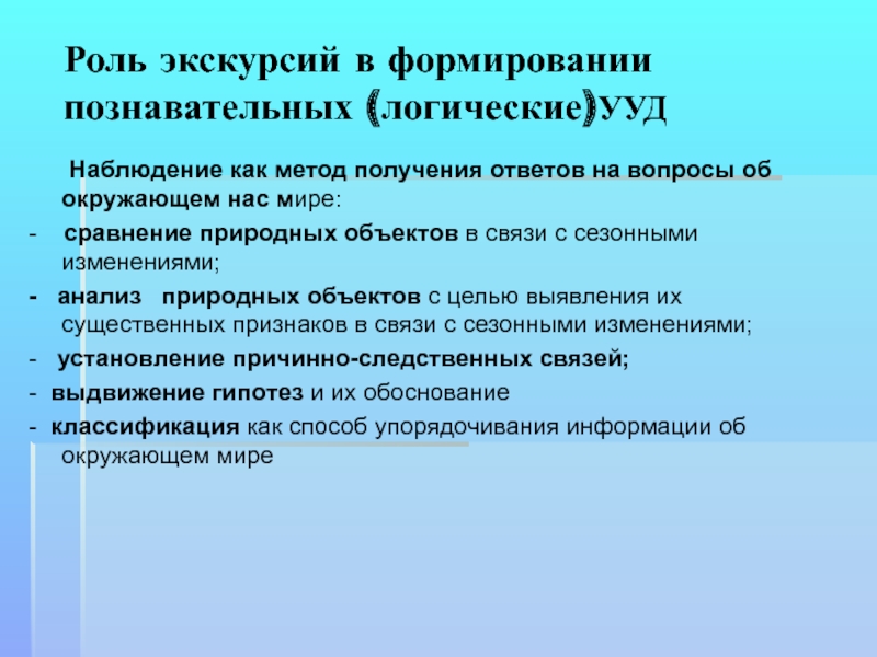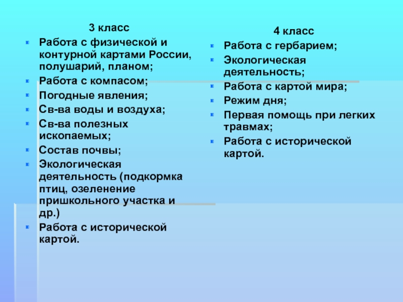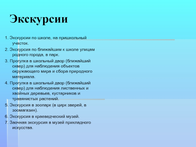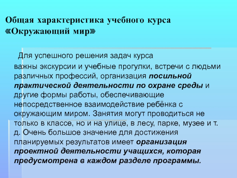 важны экскурсии и учебные прогулки, встречи с людьми различных профессий, организация посильной практической деятельности по охране среды и другие формы работы, обеспечивающие непосредственное взаимодействие ребёнка с окружающим миром. Занятия могут проводиться не только в классе, но и на улице, в лесу, парке, музее и т. д. Очень большое значение для достижения планируемых результатов имеет организация проектной деятельности учащихся, которая предусмотрена в каждом разделе программы.