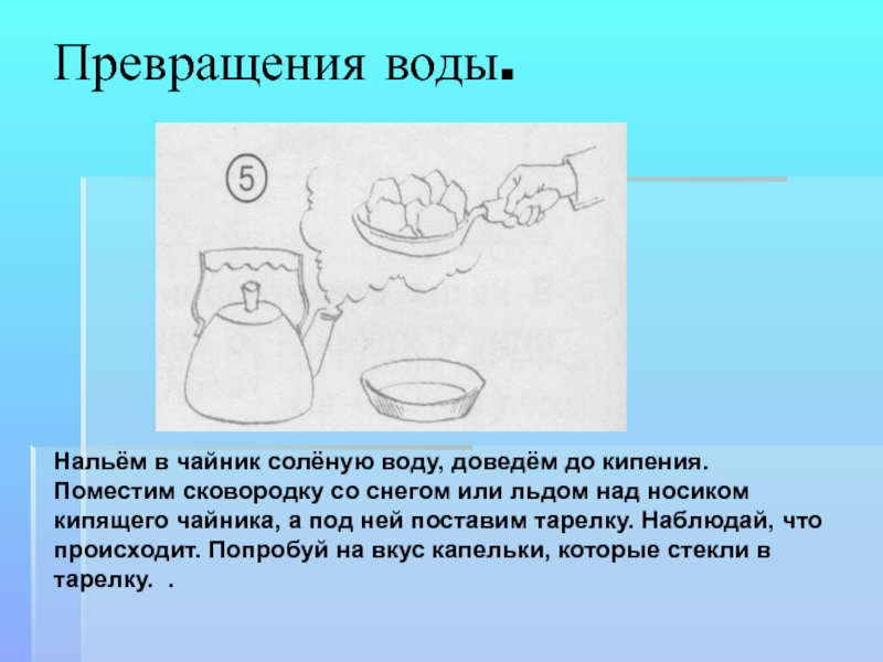 со снегом или льдом над носиком кипящего чайника, а под ней поставим тарелку. Наблюдай, что происходит. Попробуй на вкус капельки, которые стекли в тарелку. .