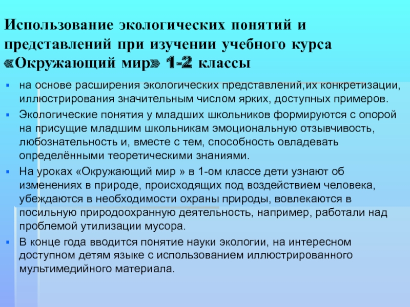 Экологические понятия у младших школьников формируются с опорой на присущие младшим школьникам эмоциональную отзывчивость, любознательность и, вместе с тем, способность овладевать определёнными теоретическими знаниями.
