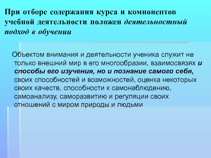 Объектом внимания и деятельности ученика служит не только внешний мир в его многообразии, взаимосвязях и способы его изучения, но и познание самого себя, своих способностей и возможностей, оценка некоторых своих качеств, способности к самонаблюдению, самоанализу, саморазвитию и регуляции своих отношений с миром природы и людьми