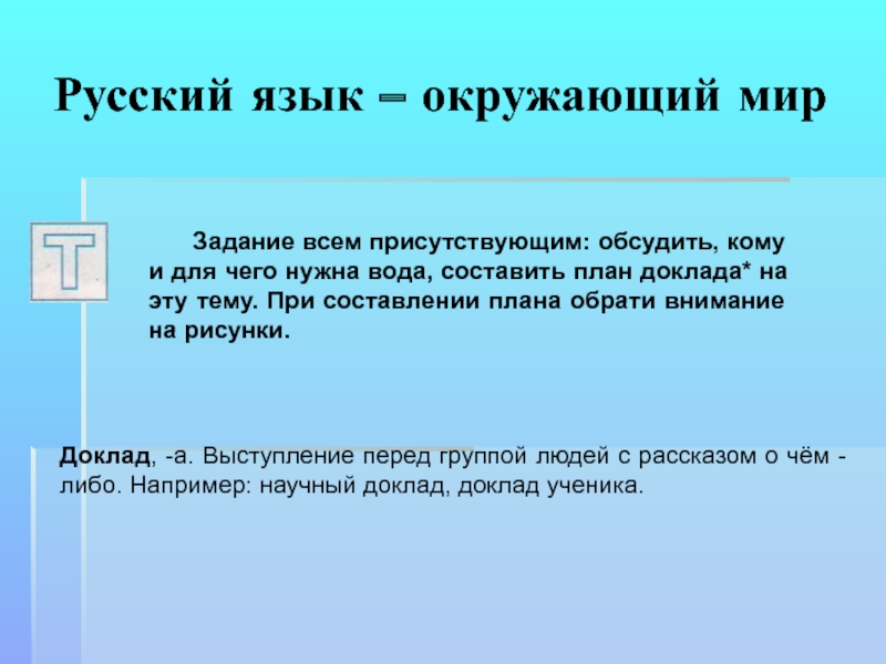 чего нужна вода, составить план доклада* на эту тему. При составлении плана обрати внимание на рисунки.