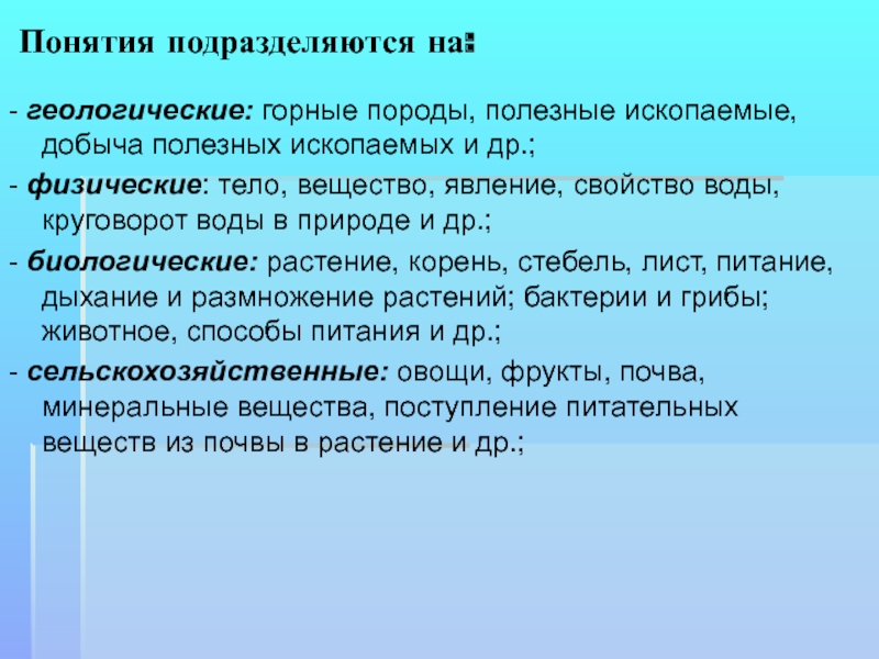 - биологические: растение, корень, стебель, лист, питание, дыхание и размножение растений; бактерии и грибы; животное, способы питания и др.;