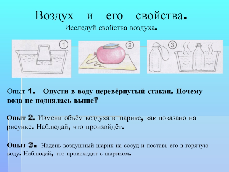 Слайд 72Опыт 1. Опусти в воду перевёрнутый стакан. Почему вода не
