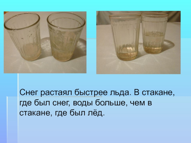Слайд 79Снег растаял быстрее льда. В стакане, где был снег, воды больше,
