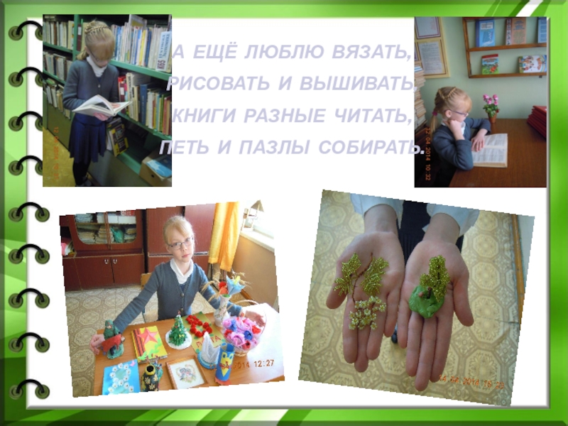 А ЕЩЁ ЛЮБЛЮ ВЯЗАТЬ,РИСОВАТЬ И ВЫШИВАТЬ,КНИГИ РАЗНЫЕ ЧИТАТЬ,ПЕТЬ И ПАЗЛЫ СОБИРАТЬ.