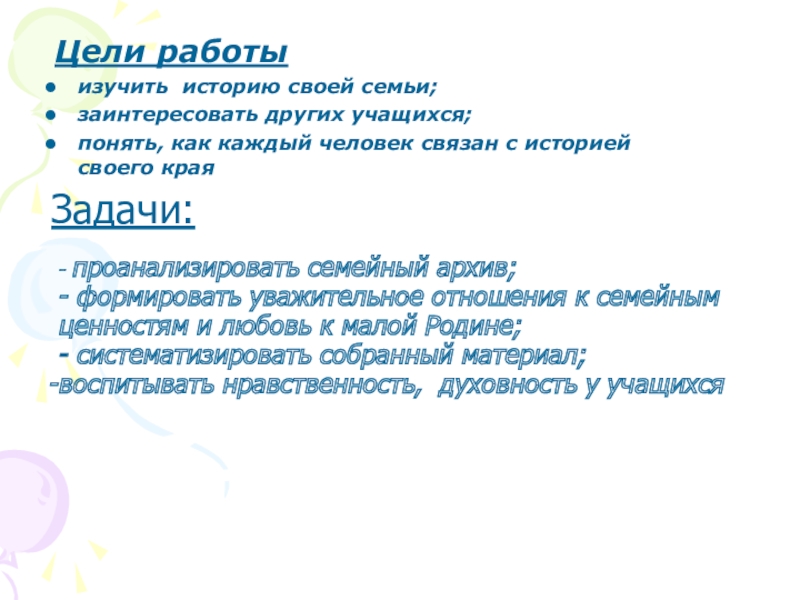 - формировать уважительное отношения к семейным ценностям и любовь к малой Родине;