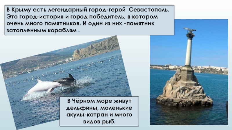 В Чёрном море живут дельфины, маленькие акулы-катран и много видов рыб.