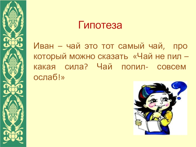 Иван – чай это тот самый чай, про который можно сказать «Чай не пил – какая сила? Чай попил- совсем ослаб!»