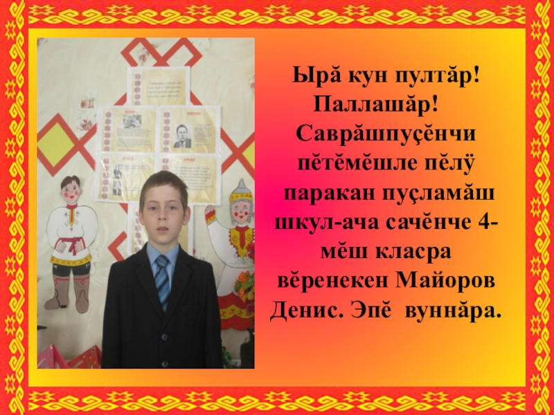 Ырă кун пултăр! Паллашăр!Саврăшпуçĕнчи пĕтĕмĕшле пĕлÿ паракан пуçламăш шкул-ача сачĕнче 4-мĕш класра вĕренекен Майоров Денис. Эпĕ вуннăра.