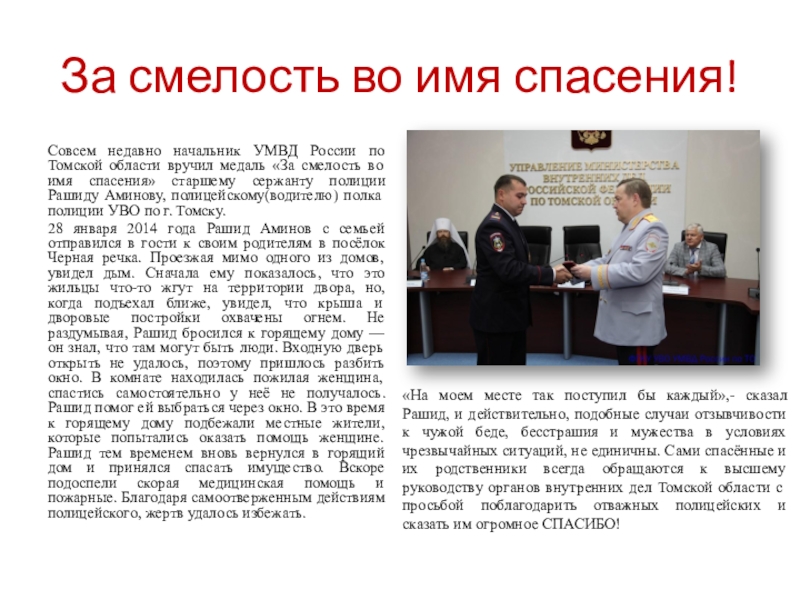 «На моем месте так поступил бы каждый»,- сказал Рашид, и действительно, подобные случаи отзывчивости к чужой беде, бесстрашия и мужества в условиях чрезвычайных ситуаций, не единичны. Сами спасённые и их родственники всегда обращаются к высшему руководству органов внутренних дел Томской области с просьбой поблагодарить отважных полицейских и сказать им огромное СПАСИБО!