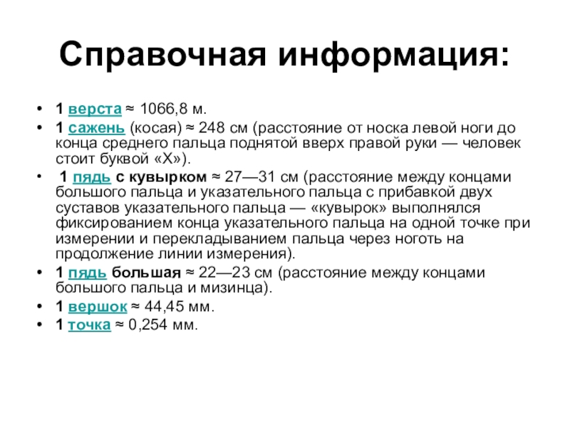 Справочная информация:1 верста ≈ 1066,8 м.1 сажень (косая) ≈ 248 см (расстояние от носка левой ноги до конца