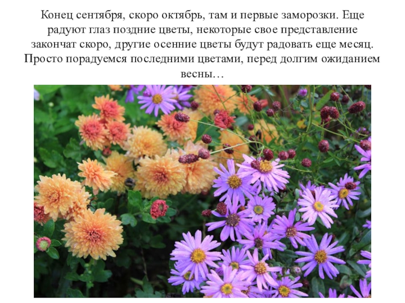 Слайд 10Конец сентября, скоро октябрь, там и первые заморозки. Еще радуют глаз