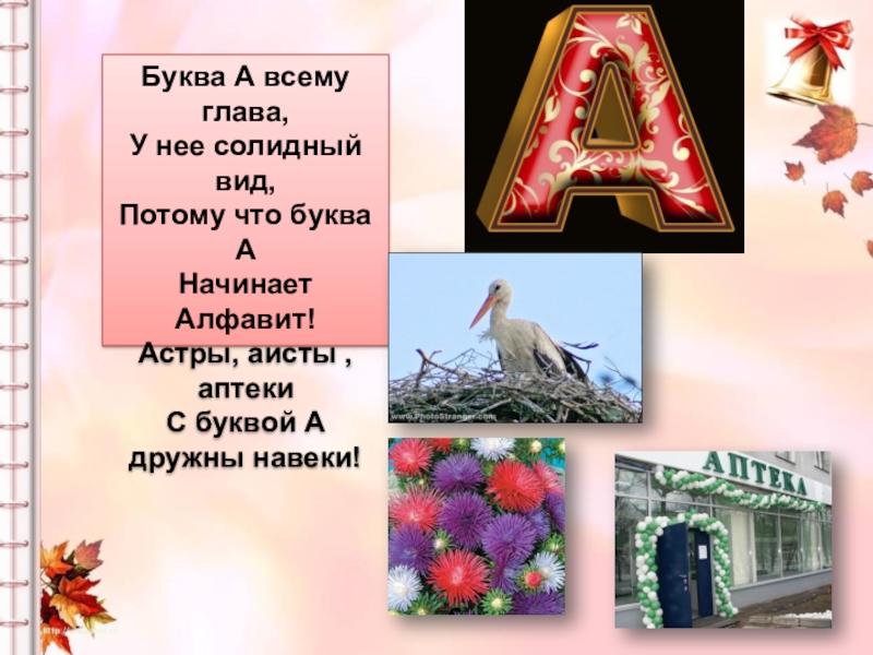 А Начинает Алфавит! Астры, аисты , аптеки С буквой А дружны навеки!