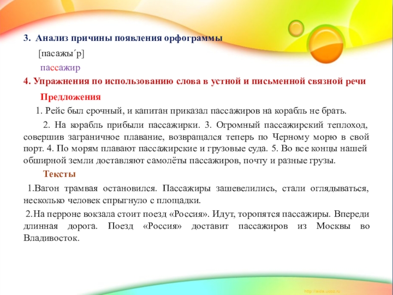 2. На корабль прибыли пассажирки. 3. Огромный пассажирский теплоход, совершив заграничное плавание, возвращался теперь по Черному морю в свой порт. 4. По морям плавают пассажирские и грузовые суда. 5. Во все концы нашей обширной земли доставляют самолёты пассажиров, почту и разные грузы.