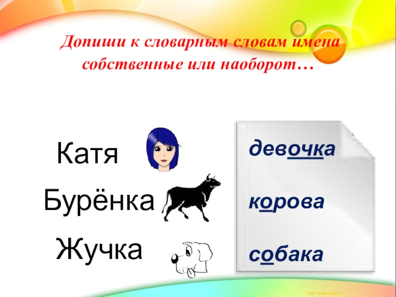 Слайд 15 Допиши к словарным словам имена собственные или наоборот…