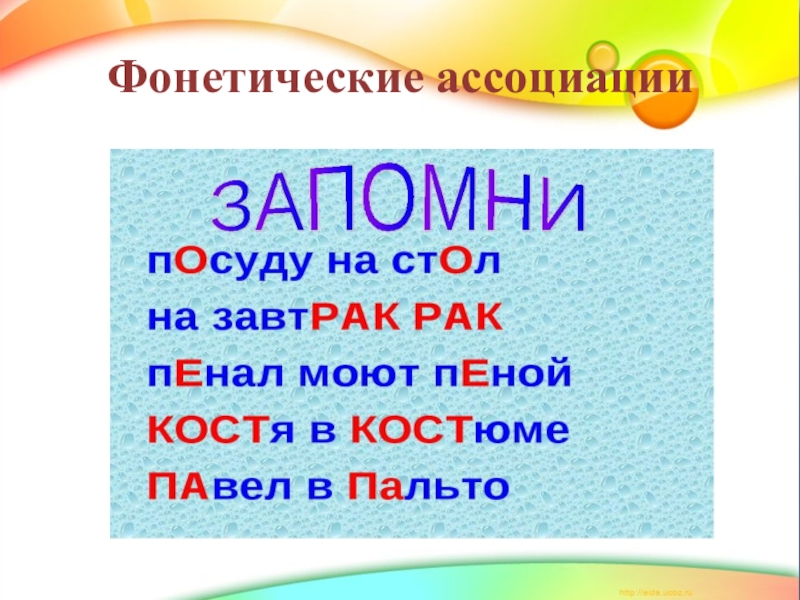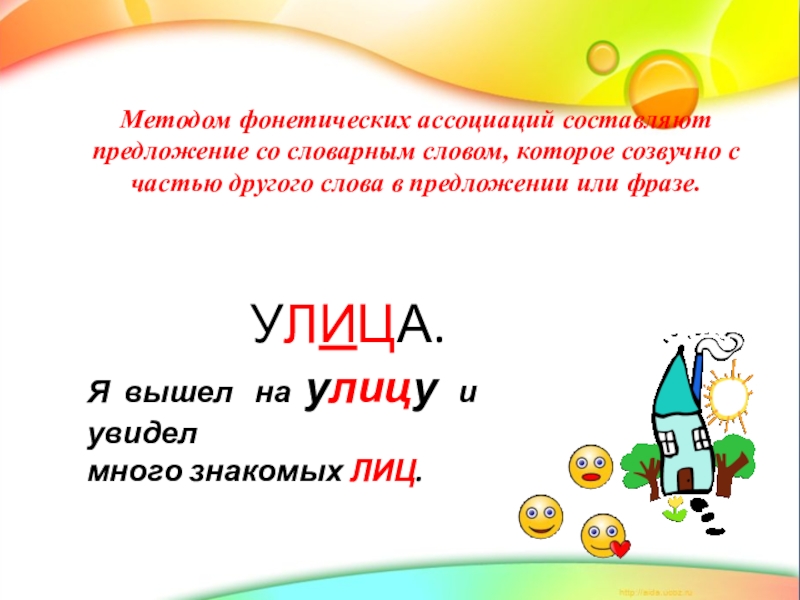Методом фонетических ассоциаций составляют предложение со словарным словом, которое созвучно