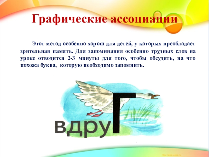 которых преобладает зрительная память. Для запоминания особенно трудных слов на уроке отводится 2-3 минуты для того, чтобы обсудить, на что похожа буква, которую необходимо запомнить.