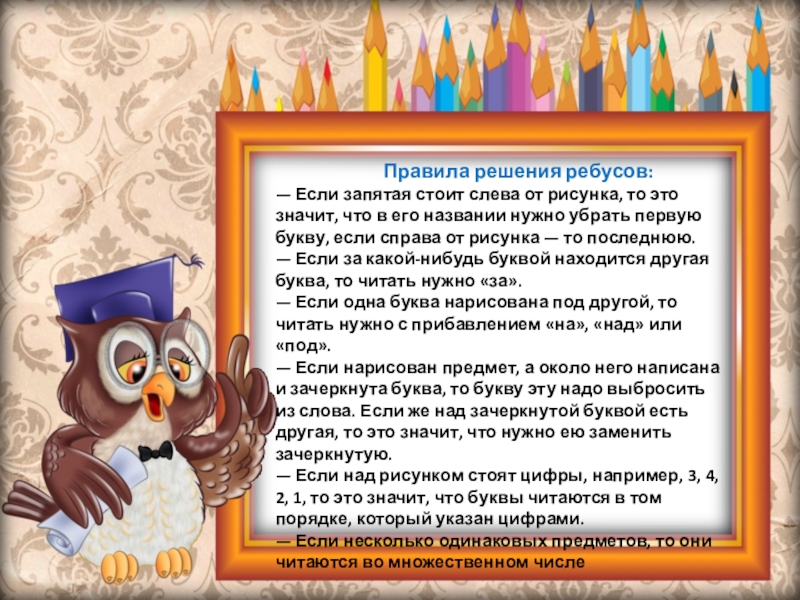 Правила решения ребусов: — Если запятая стоит слева от рисунка, то это значит, что в его названии нужно убрать первую букву, если справа от рисунка — то последнюю. — Если за какой-нибудь буквой находится другая буква, то читать нужно «за». — Если одна буква нарисована под другой, то читать нужно с прибавлением «на», «над» или «под». — Если нарисован предмет, а около него написана и зачеркнута буква, то букву эту надо выбросить из слова. Если же над зачеркнутой буквой есть другая, то это значит, что нужно ею заменить зачеркнутую. — Если над рисунком стоят цифры, например, 3, 4, 2, 1, то это значит, что буквы читаются в том порядке, который указан цифрами. — Если несколько одинаковых предметов, то они читаются во множественном числе