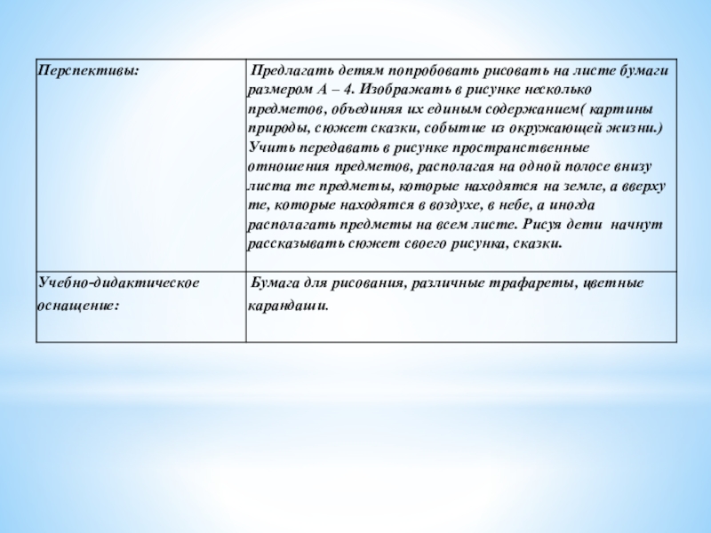 Обучающая: научить созданию изображений в технике трафарет. Развивающая: развивать у детей навыки работы цветными карандашами, способствовать развитию самостоятельности. Воспитательная: воспитывать наблюдательность, интерес к изобразительному искусству, дисциплинированность.