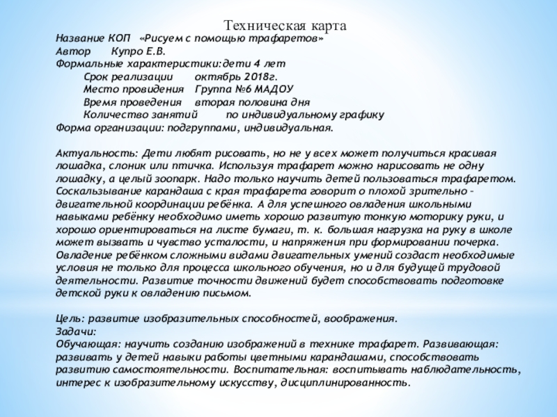 Техническая картаНазвание КОП «Рисуем с помощью трафаретов»Автор Купро Е.В.Формальные характеристики: дети 4 лет Срок реализации октябрь 2018г. Место провидения Группа №6 МАДОУ Время проведения вторая половина дня Количество занятий по индивидуальному графикуФорма организации: подгруппами, индивидуальная. Актуальность: Дети любят рисовать, но не у всех может получиться красивая лошадка,