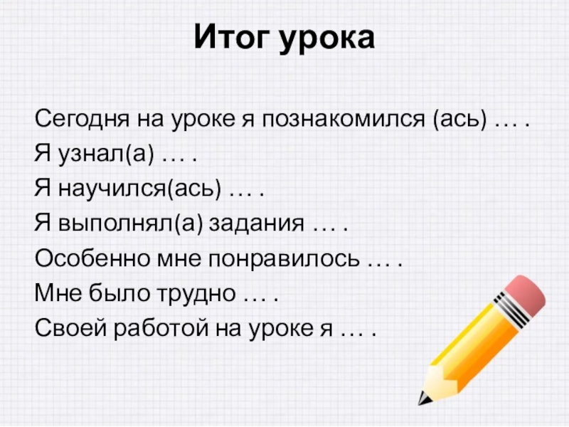 Итог урокаСегодня на уроке я познакомился (ась) … .Я узнал(а) … .Я научился(ась) … .Я выполнял(а) задания