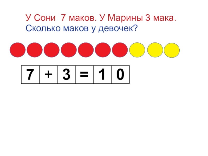 У Сони 7 маков. У Марины 3 мака.   Сколько маков у девочек?7+3=10