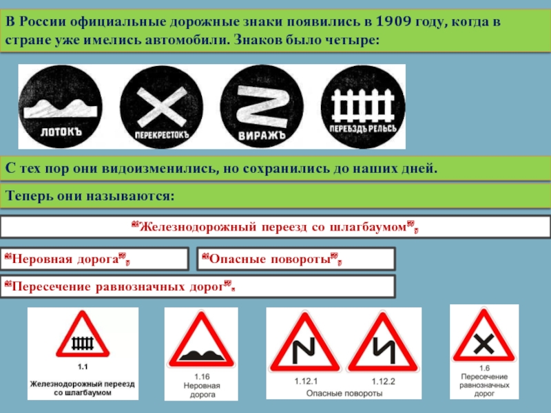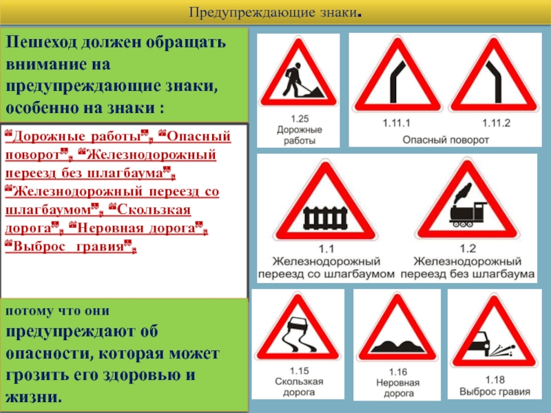 “Дорожные работы”, “Опасный поворот”, “Железнодорожный переезд без шлагбаума”, “Железнодорожный переезд со шлагбаумом”, “Скользкая дорога”, “Неровная дорога”, “Выброс гравия”,