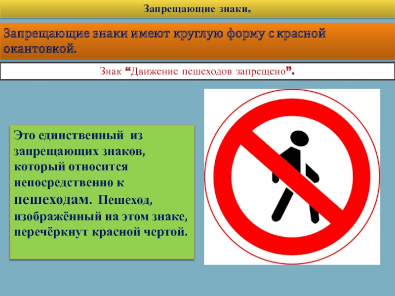 Это единственный из запрещающих знаков, который относится непосредственно к пешеходам. Пешеход, изображённый на этом знаке, перечёркнут красной чертой.