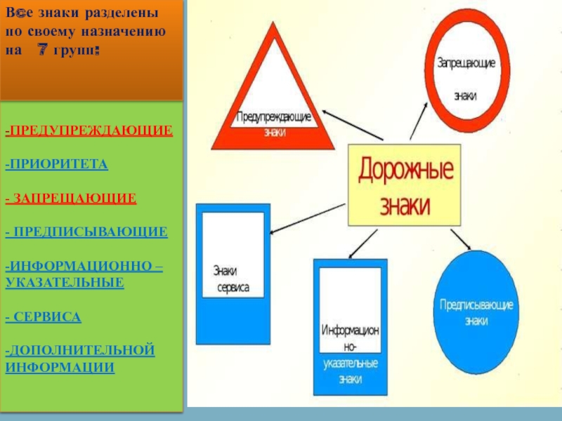 Вcе знаки разделены по своему назначению на 7 групп: