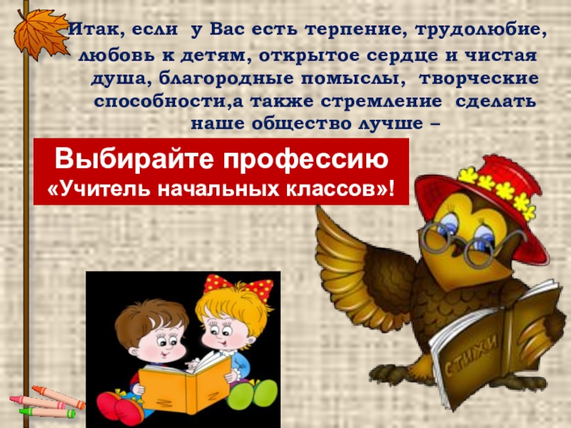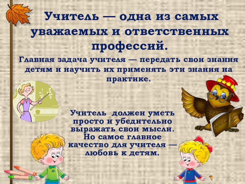 Учитель должен уметь просто и убедительно выражать свои мысли. Но самое главное качество для учителя — любовь к детям.