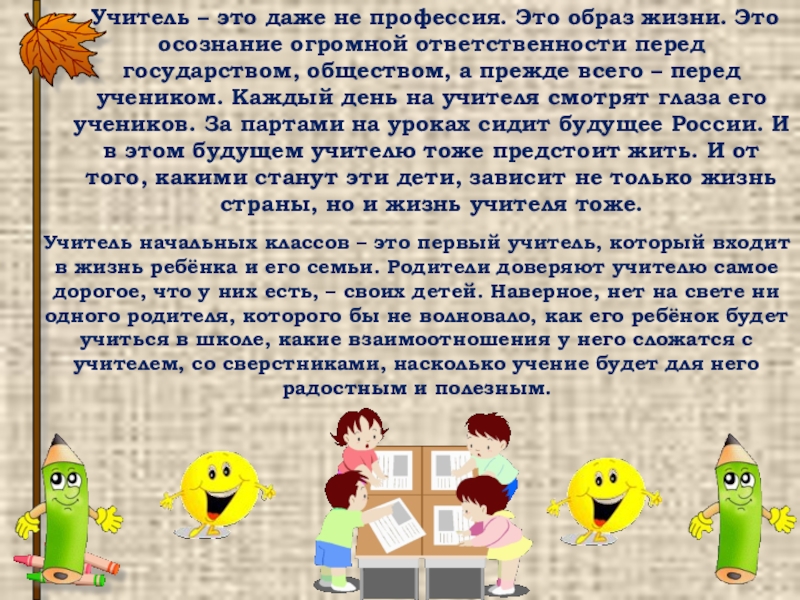 Учитель начальных классов – это первый учитель, который входит в жизнь ребёнка и его семьи. Родители доверяют учителю самое дорогое, что у них есть, – своих детей. Наверное, нет на свете ни одного родителя, которого бы не волновало, как его ребёнок будет учиться в школе, какие взаимоотношения у него сложатся с учителем, со сверстниками, насколько учение будет для него радостным и полезным.