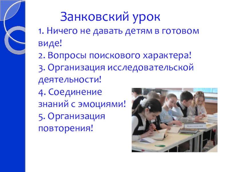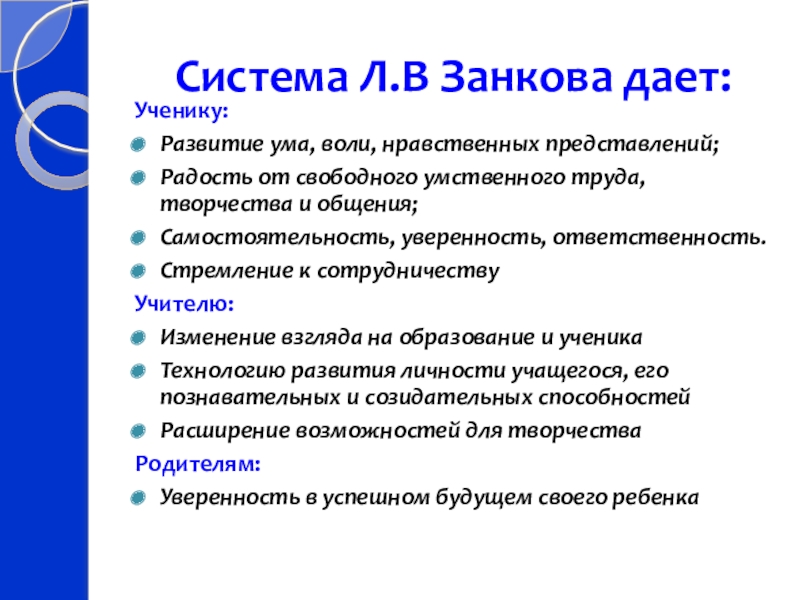 Система, разработанная нашим соотечественником, крупнейшим специалистом в области психологии и педагогики академиком Леонидом Владимировичем Занковым, создает условия для развития качеств личности ребенка.