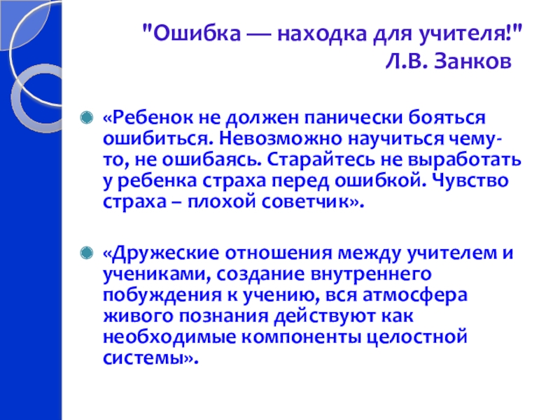 «Ребенок не должен панически бояться ошибиться. Невозможно научиться чему-то, не ошибаясь. Старайтесь не выработать у ребенка страха перед ошибкой. Чувство страха – плохой советчик».