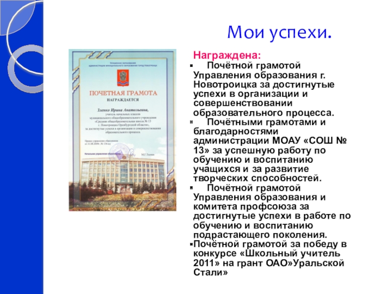 Почётными грамотами и благодарностями администрации МОАУ «СОШ № 13» за успешную работу по обучению и воспитанию учащихся и за развитие творческих способностей.
