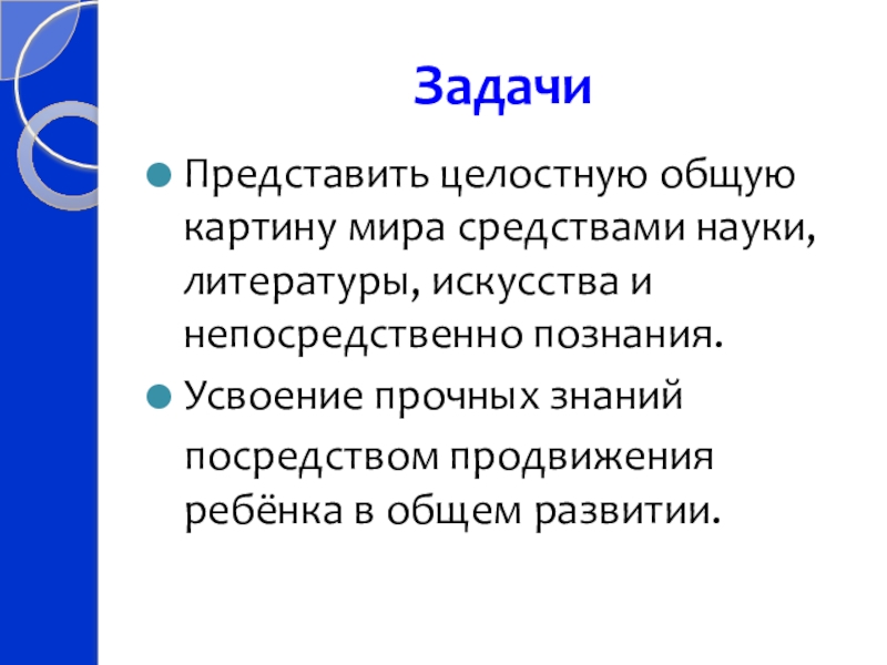 Представить целостную общую картину мира средствами науки, литературы, искусства и непосредственно