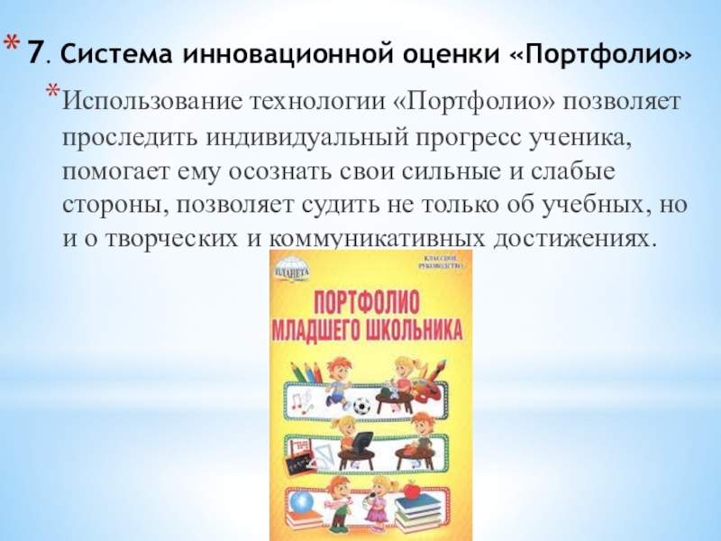ученика, помогает ему осознать свои сильные и слабые стороны, позволяет судить не только об учебных, но и о творческих и коммуникативных достижениях.