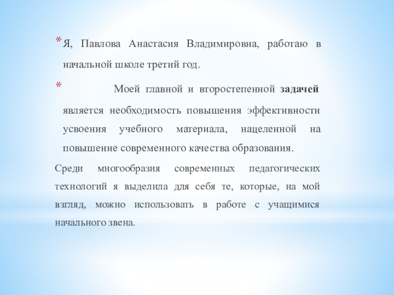 Слайд 2Я, Павлова Анастасия Владимировна, работаю в начальной школе третий год.