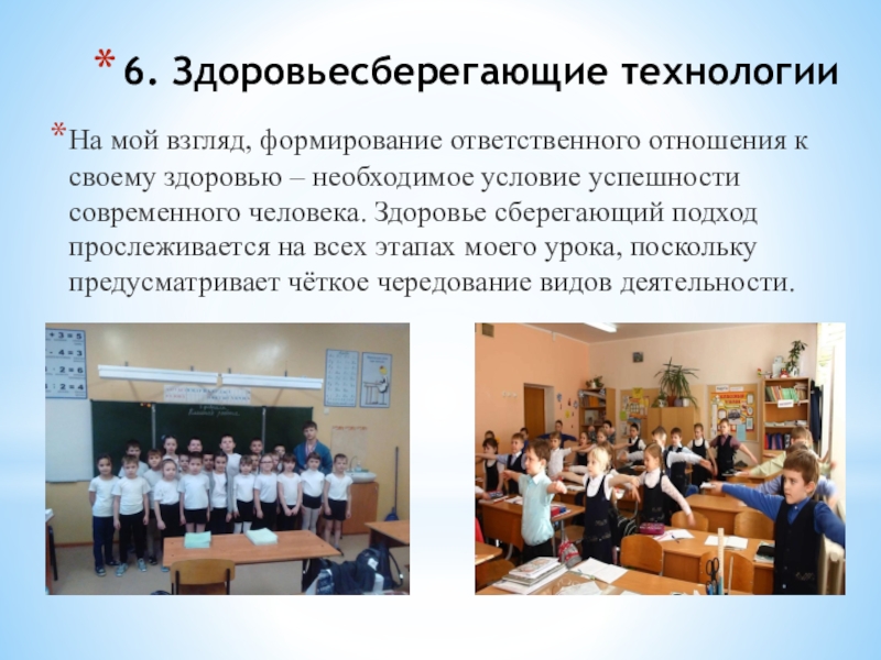 – необходимое условие успешности современного человека. Здоровье сберегающий подход прослеживается на всех этапах моего урока, поскольку предусматривает чёткое чередование видов деятельности.