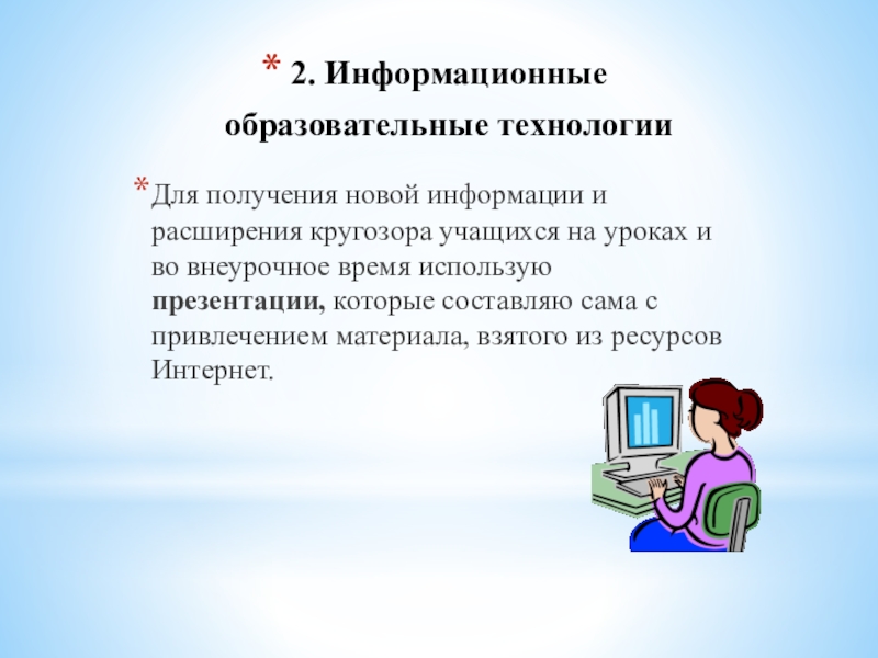 учащихся на уроках и во внеурочное время использую презентации, которые составляю сама с привлечением материала, взятого из ресурсов Интернет.