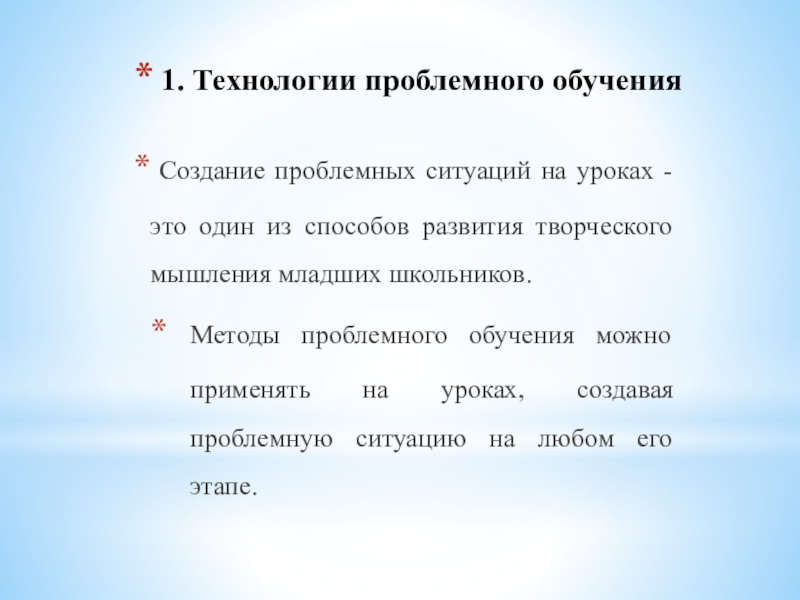 Методы проблемного обучения можно применять на уроках, создавая проблемную ситуацию на любом его этапе.