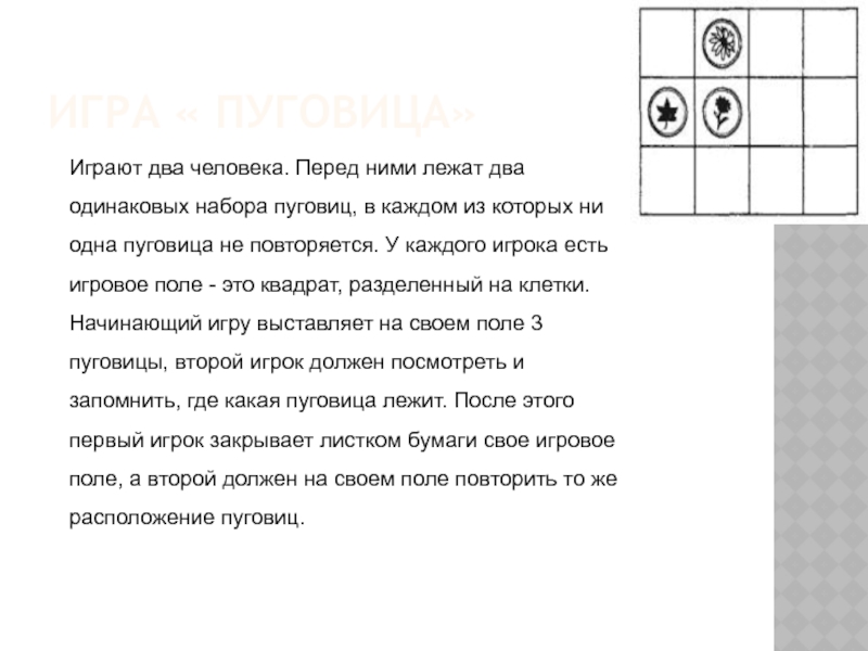 пуговиц, в каждом из которых ни одна пуговица не повторяется. У каждого игрока есть игровое поле - это квадрат, разделенный на клетки. Начинающий игру выставляет на своем поле 3 пуговицы, второй игрок должен посмотреть и запомнить, где какая пуговица лежит. После этого первый игрок закрывает листком бумаги свое игровое поле, а второй должен на своем поле повторить то же расположение пуговиц.