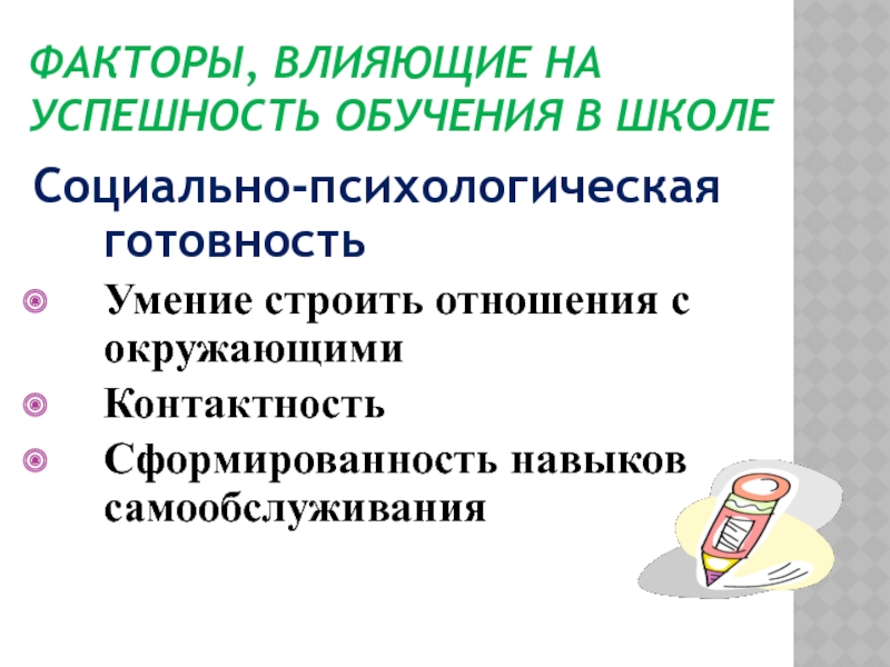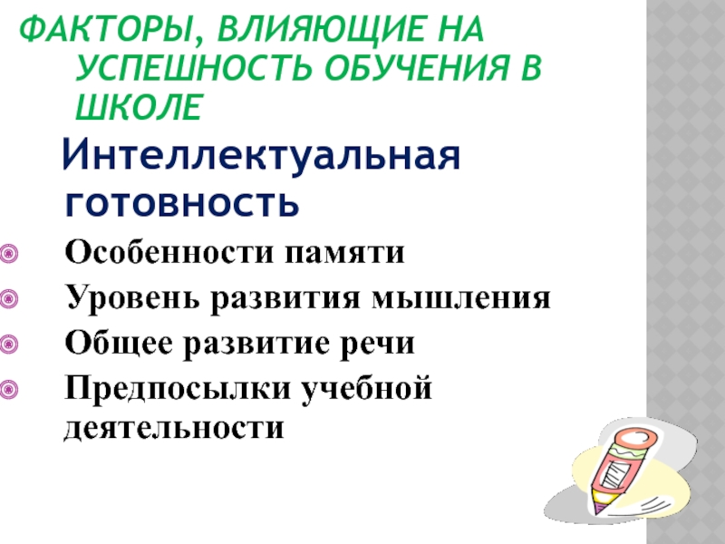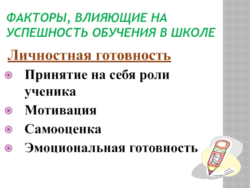 Слайд 4ФАКТОРЫ, ВЛИЯЮЩИЕ НА УСПЕШНОСТЬ ОБУЧЕНИЯ В ШКОЛЕ