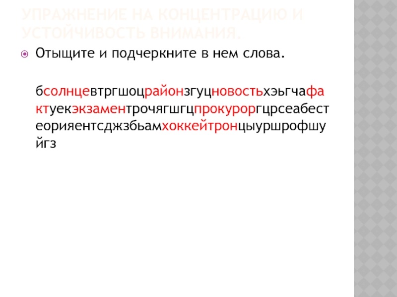 Слайд 22УПРАЖНЕНИЕ НА КОНЦЕНТРАЦИЮ И УСТОЙЧИВОСТЬ ВНИМАНИЯ.