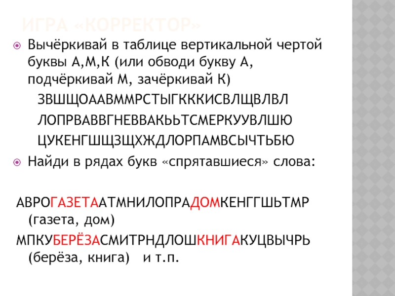 Вычёркивай в таблице вертикальной чертой буквы А,М,К (или обводи букву