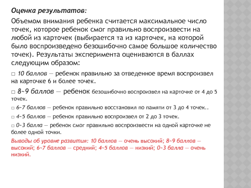 правильно воспроизвести на любой из карточек (выбирается та из карточек, на которой было воспроизведено безошибочно самое большое количество точек). Результаты эксперимента оцениваются в баллах следующим образом: