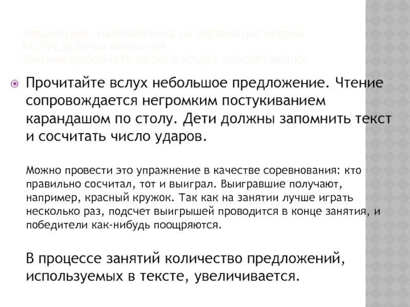 Слайд 29УПРАЖНЕНИЕ, НАПРАВЛЕННОЕ НА УВЕЛИЧЕНИЕ УРОВНЯ РАСПРЕДЕЛЕНИЯ ВНИМАНИЯ