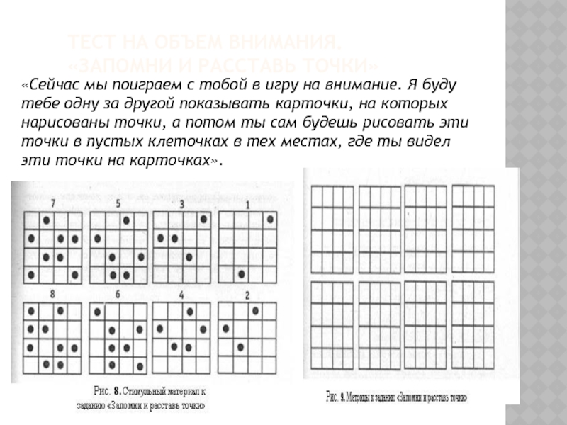 тобой в игру на внимание. Я буду тебе одну за другой показывать карточки, на которых нарисованы точки, а потом ты сам будешь рисовать эти точки в пустых клеточках в тех местах, где ты видел эти точки на карточках».